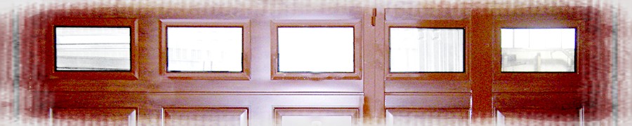 Porte basculanti con pannello coibentato bugnato, porte pedonali e lunotti con vetro.